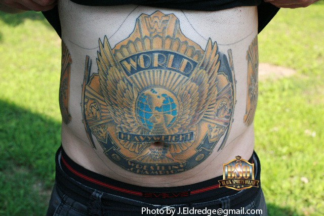 Last week we published an article (available here) about an anonymous wrestling fan who had a tattoo of the old WWF Winged Eagle Championship Belt across his gut. The story spread accross the internet, eventually landing on the facebook page of Justin Deming, a 29 year old “Enabler” (the most accurate name for a bartender I have ever heard) and father of a ten month old son, who identified himself as the owner of the previously anonymous belly.