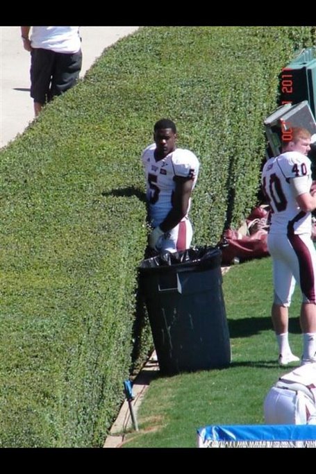 I think UGA football players will have new bulletin board material whenever they play Mississippi State again. During the game this past Saturday Mississippi State defensive back Nickoe Whitley was caught taking a bathroom break in the hedges.