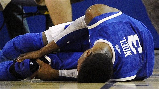 The news is not good for Kentucky star freshman Nerlen Noel who went down in a heap last night after trying to block a shot.