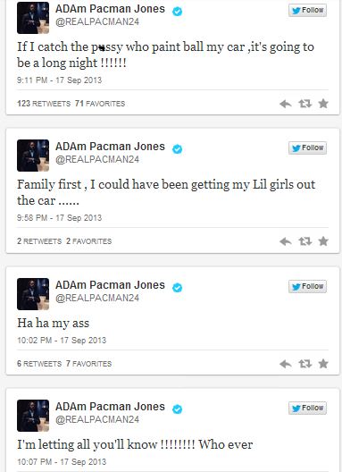 If you are the person or persons who paintballed Pacman Jones’ car, I would advise you to lay low for a while. Pacman is not pleased and he went to Twitter to express his frustrations.