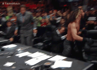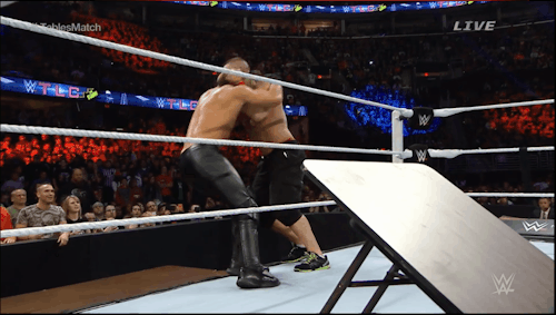 Back inside the ring, a table is set up in the corner and another is in the center of the ring, but the referee is knocked outside of the ring and unable to see what happens inside. Cena tries to get Rollins, but Mr. Money in the Bank is a cross-fit expert who can just hop over your feeble attempts.