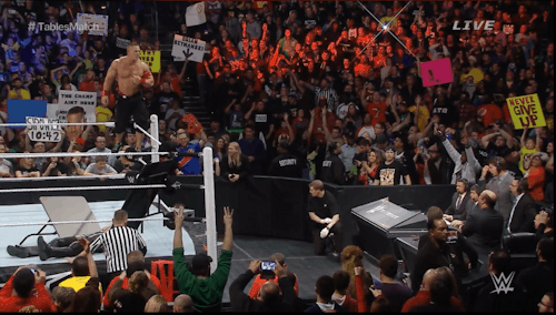 Both men go through a table at the same exact time. The ref who is recovering ringside and witnesses it all, calls for the bell, only he has no idea who won. Two other refs come out to discuss and one raises Cena’s arm while the other raises Rollins, so the head ref decides to just restart the match entirely, since that makes more sense than the other refs telling him Cena won while he was knocked out.