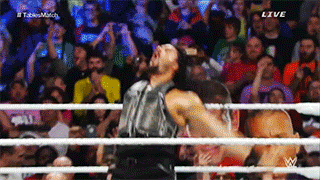 As things continue to break down, Big Show makes his way out to the ring to ruin Cena’s night again. Show tosses Cena around and gets ready to chokeslam him through a table and give Rollins the wi— HEY THAT’S ROMAN REIGNS MUSIC!