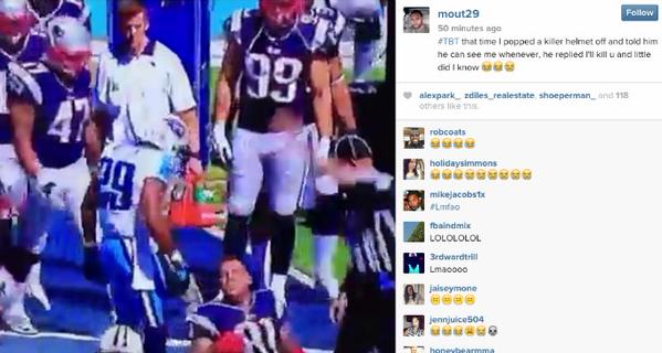 After Hernandez caught a short pass from Tom Brady, Mouton tackled him out-of-bounds and yelled “I’m gonna fuck you up all day, bitch!”