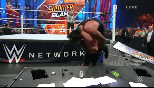 Lesnar picks Taker up and tries another but Taker dives under the turnbuckle and Lesnar’s head bounces off the second buckle to stun the Beast.