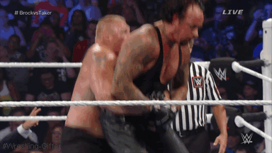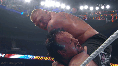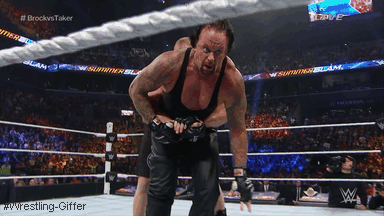 Lesnar picks Taker up and the Dead Man tells him hes’ gonna have to before somehow hitting Lesnar with a MASSIVE chokeslam!