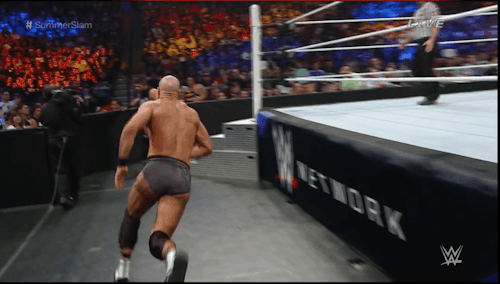Owens rolls out and starts to walk away, so Cesaro tries to catch him but ends up being thrown into the barricade. Owens follows it up with an awesome cannonball!
