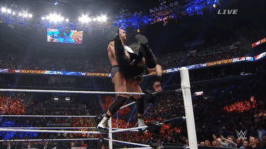 Owens knocks Cesaro down and climbs on top yelling at the crowd, and the momentary distraction allows Cesaro to hit him with an uppercut before hitting an unbelievable gutwrench suplex off the top rope for the near-fall!