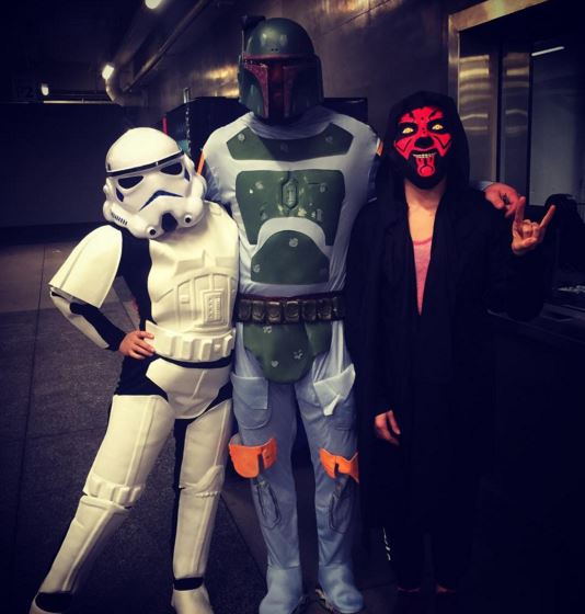 Ronda Rousey got caught up in all the Star Wars excitement last night. Rousey not only attended the midnight premiere but dressed up as a stormtropper. Ronda wasn’t alone in costume as she was joined by BF Travis Browne and Marina Shafir.