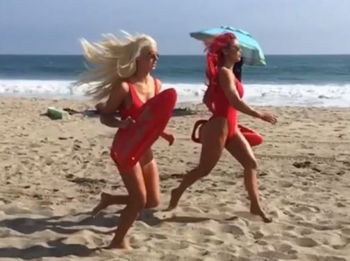 The two friends gave a preview of the entertainment we’ll be sure to enjoy — pulling off this stunning Baywatch reenactment.