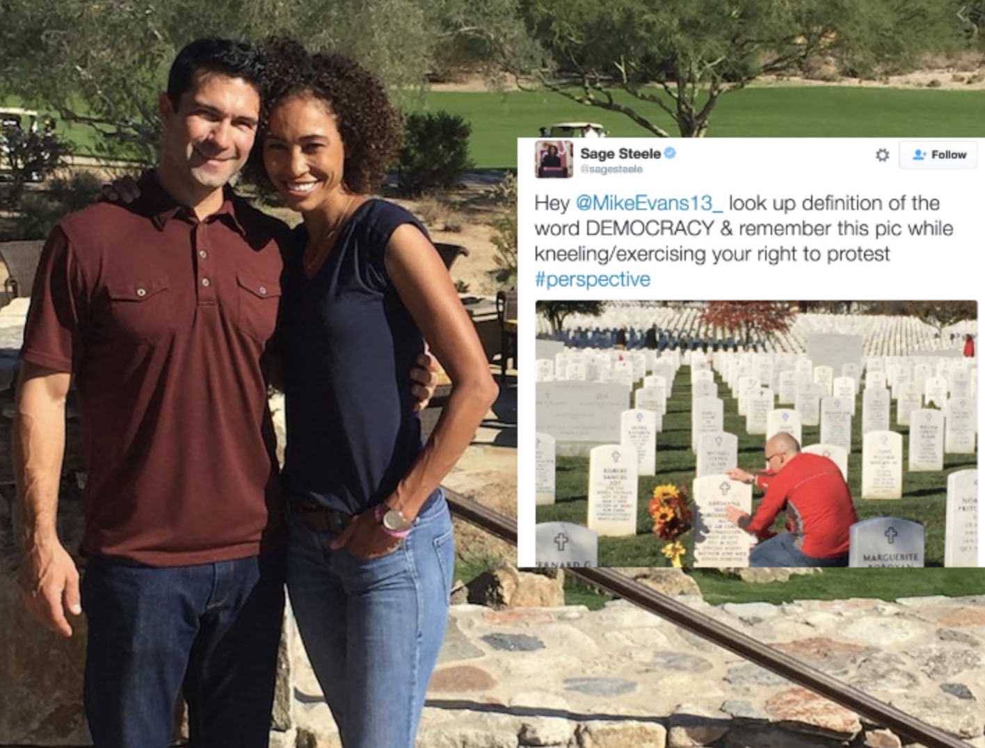 Mike Evans was upset that Donald Trump had become the President. Why is that important? Sage Steele voted for Trump and is a Trump supporter. Like many Trump supporters she lives in the shadows, because the only way Trump could have won is because a lot of people like Steele who will never publicly admit it voted for him.