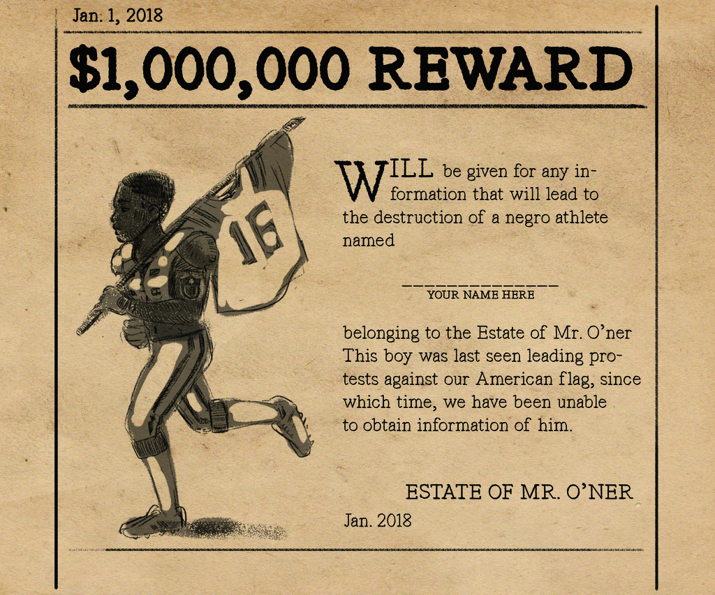 Part one of the provocative two-part piece is a mock-up slave bill asking that protesting “boys” be returned to their owners. Part two illustrates the varied insults sports fans lob at athletes while ignoring why protests were initiated, to begin with.
