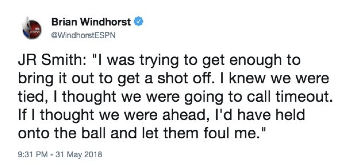 JR Smith’s outstanding rebound over Draymond Green, followed by blunderous decision to dribble the ball out instead of attempting a game-winning shot, is undoubtedly the Cavs blackeye of a well-fought battle in game 1 of the NBA finals against the Warriors.