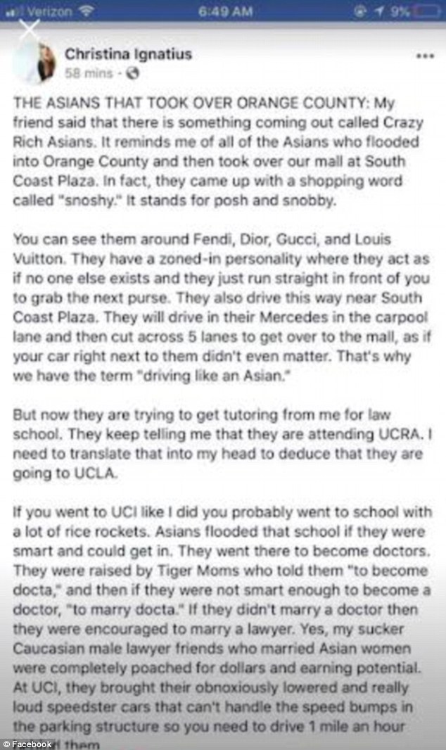 Ignatius titled the post ‘THE ASIANS TOOK OVER ORANGE COUNTY.’ She wrote in the post that Orange County were exceeding the amount of Asians she believes should be in the county apparently. ‘They have a zoned-in personality where they act as if no one else exists and they just run straight in front of you to grab the next purse,’ Ignatius wrote.