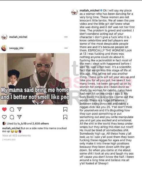 Maliah Michel is an ex-stripper and she had some different thoughts on the R Kelly documentary. Her main point is the young girls are to blame for some of the situations they are in.
