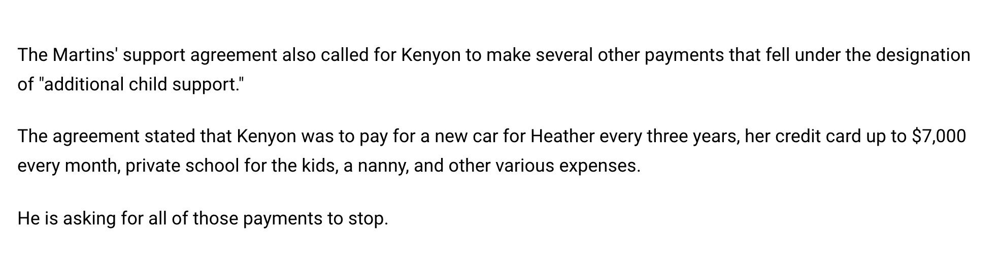 Kenyon has petitioned the court for relief from the current order due to a significant decrease in his yearly income. The current coach reports that his annual earnings are currently a little over $300,000.00, a far cry from the $108 million he is reported to have earned over his playing career.