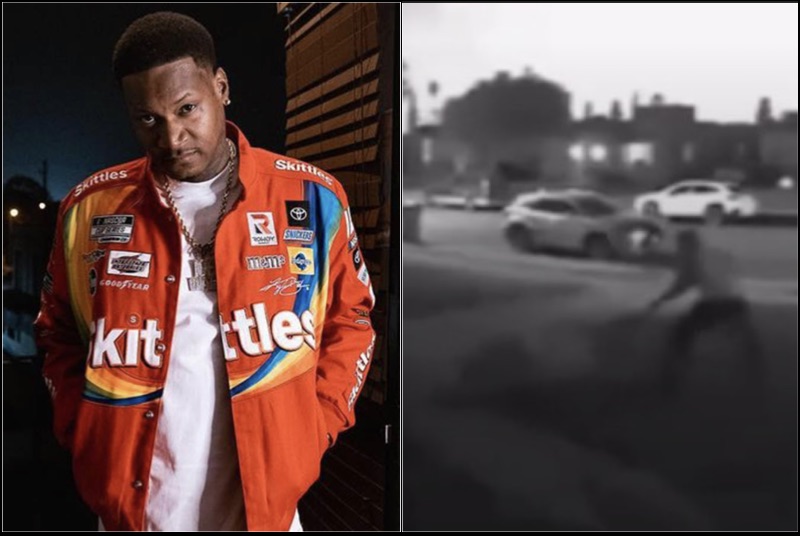 You can see Slim 400 sitting on the driver’s side of a car parked in a driveway in Inglewood as the gunman sneaks up and points a gun at him. It is unclear at this time if the gunman was just trying to rob, carjack or murder Slim 400 because he didn’t start shooting immediately.