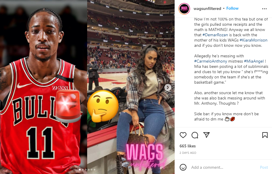 It’s alleged that DeMar DeRozan is back with his baby momma Kiara Morrison and sleeping with Carmelo Anthony’s secret baby momma Mia Angel. This hot tea was spilled on WagsUnfiltered on Instagram.
