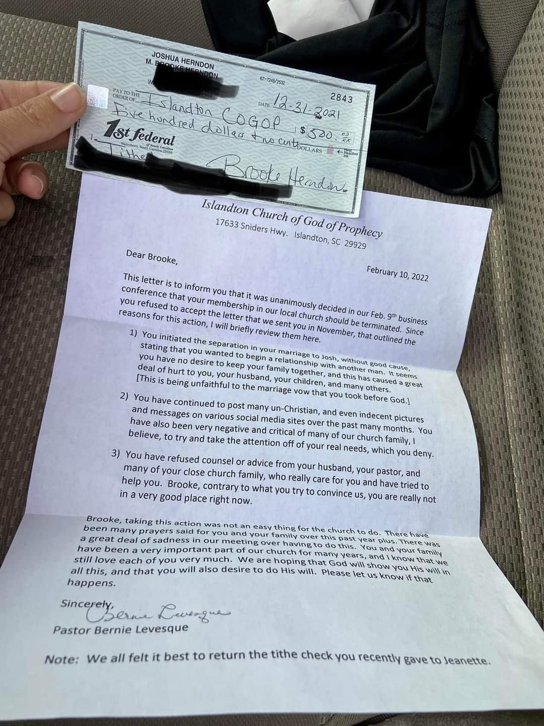 So, these are the above reasons why Islandton Church of God of Prophesy has kicked out Brooke Herndon and refunded her recent $500 tithe.