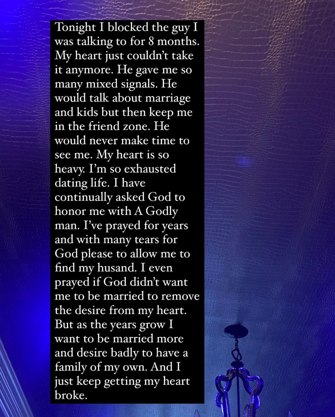 “Tonight I blocked the guy I was talking to for 8 months. My heart just couldn’t take it anymore,” Jones wrote in her post. “He gave me so many mixed signals. He would talk about marriage and kids but then keep me in the friend zone. He would never make time to see me. My heart is so heavy.”