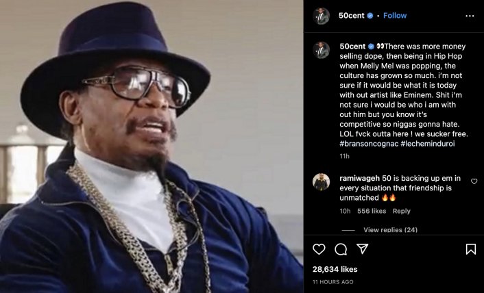 50 went on to say, “There was more money selling dope than being in Hip Hop when Melly Mel was popping, the culture has grown so much. i’m not sure if it would be what it is today without artists like Eminem.” He continued, “S**t I’m not sure I would be who I am without him, but you know it’s competitive, so n***as gonna hate. LOL f**k outta here! we sucker free.”