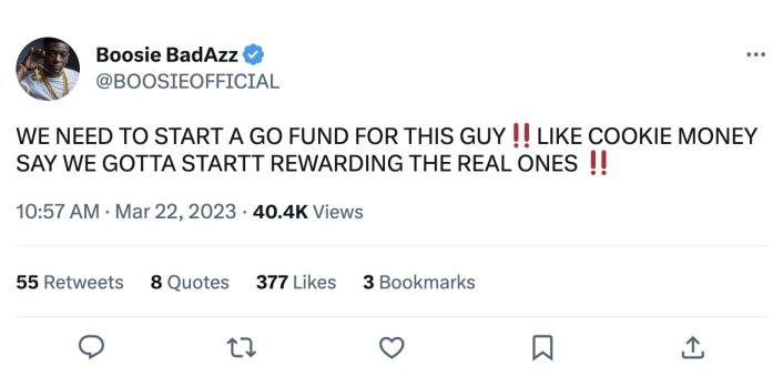 Boosie reacted to the video on Twitter, writing, “Lmao SNITCHES GET STITCHES LETS START A GO FUND FOR THIS GUY.” He added, “WE NEED TO START A GO FUND FOR THIS GUY LIKE COOKIE MONEY SAY WE GOTTA STARTT REWARDING THE REAL ONES.”
