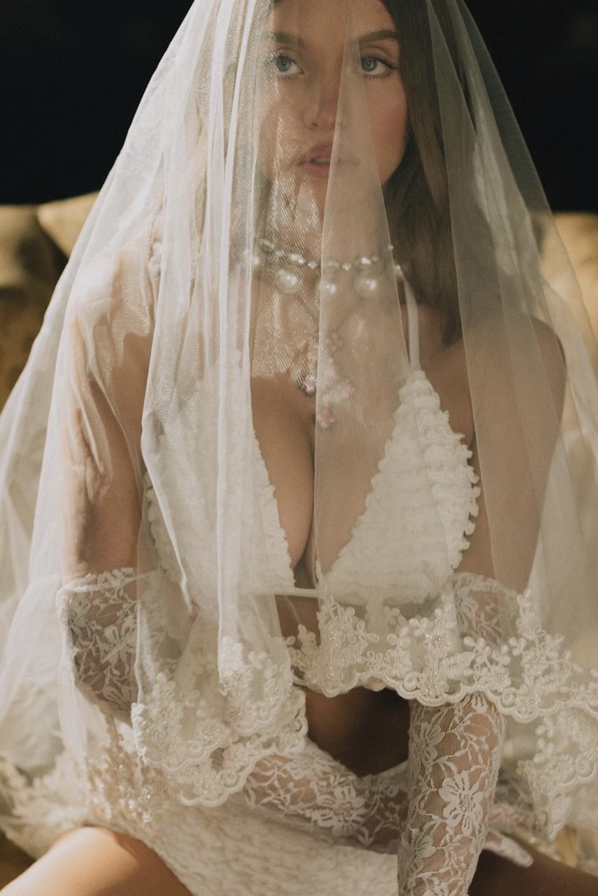 She rocked the bridal white two-piece with a veil, lace gloves, large statement pearls and a cross necklace.