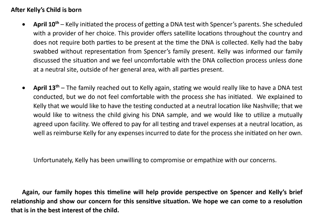 “Since Spencer isn’t able to handle this situation himself, we have tried to navigate this sensitive space as a family. That being said, our family has doubts and concerns regarding the paternity of this child for a multitude of reasons. Until this point, we’ve remained silent in hopes that a DNA test would confirm Spencer as the father.