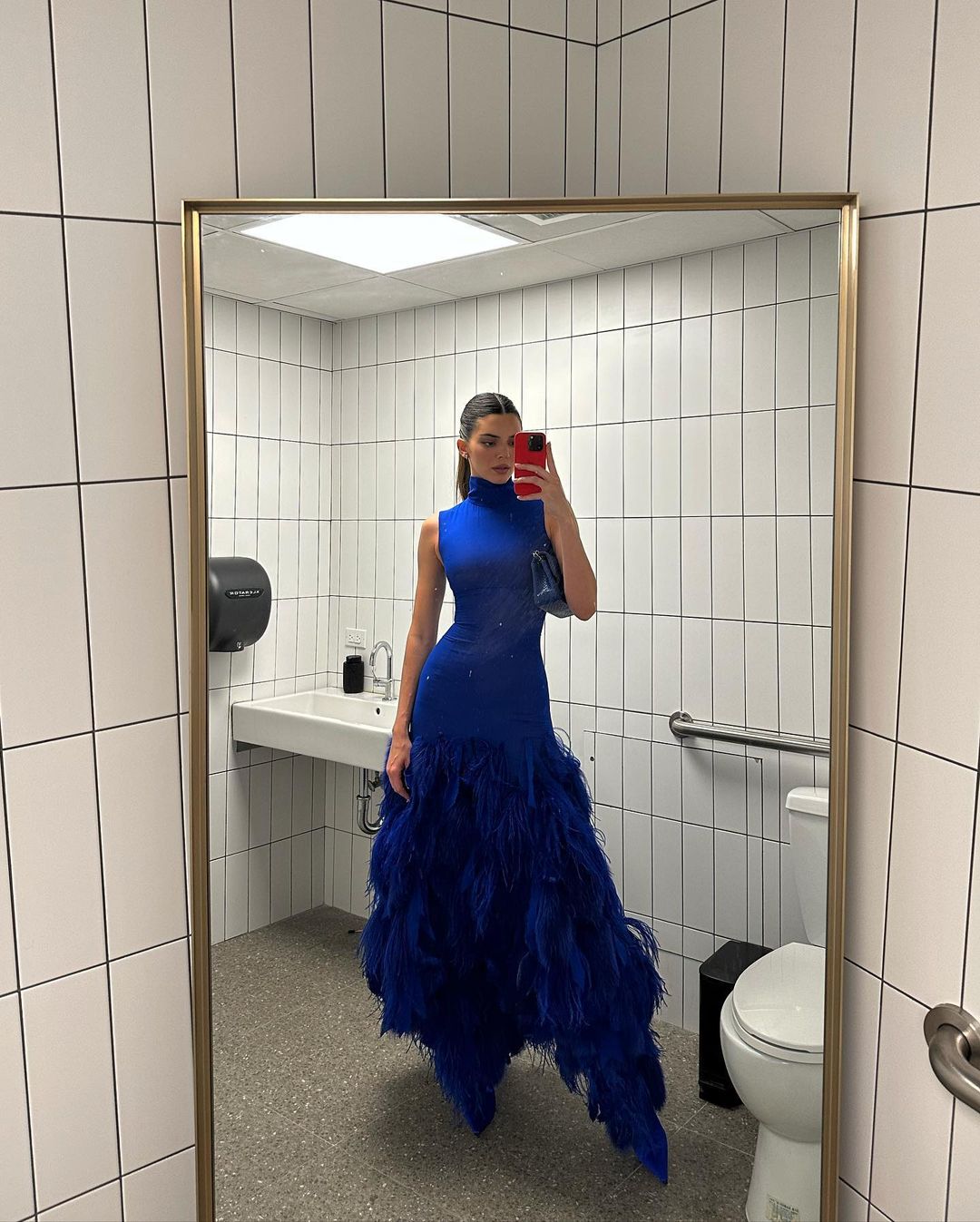 She paired the look with a crocodile-embossed blue Chanel clutch.