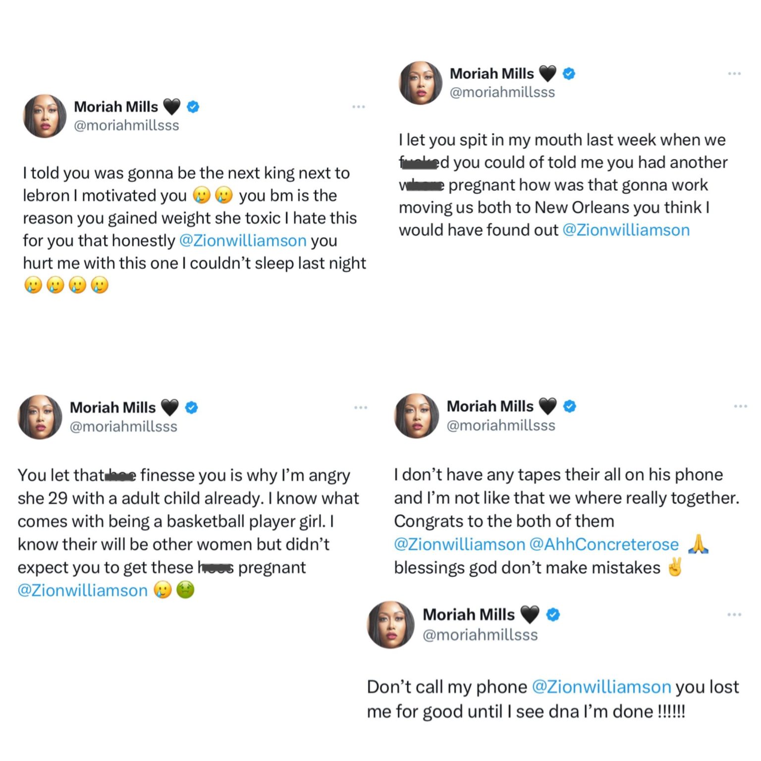 Additionally, Moriah Mills alleged that she and Williamson were just together last week in New Orleans, and she hinted that she could (possibly) be with a child as well.