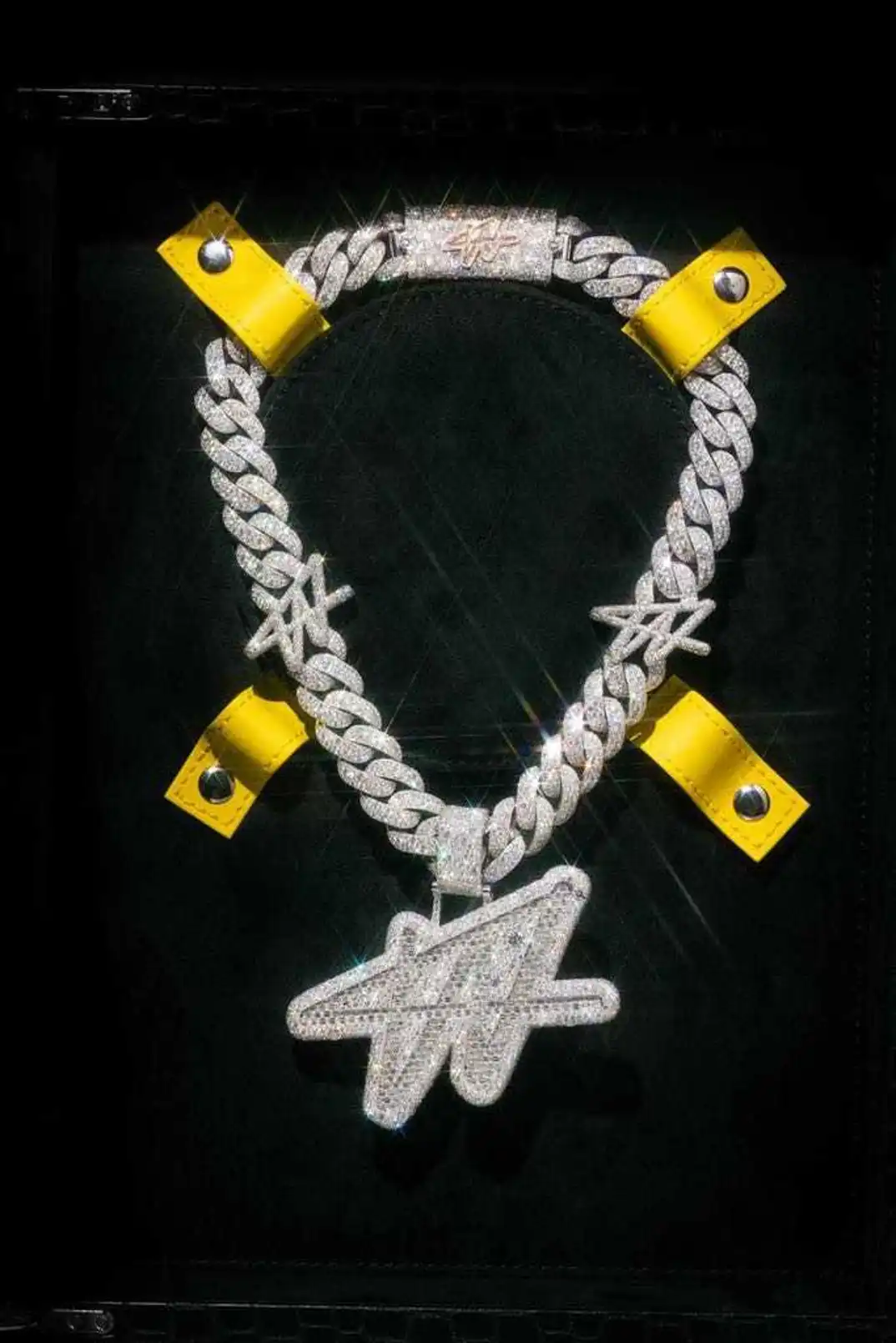 In addition to making sure the pendant exactly resembled the W logo, Vobara, who has created jewelry for celebrities like Rick Ross, Udonis Haslem, and DJ Khaled, also told us that it was packed with VS/VVS diamonds, including 20, 50, and 80 pointers in a mosaic arrangement.