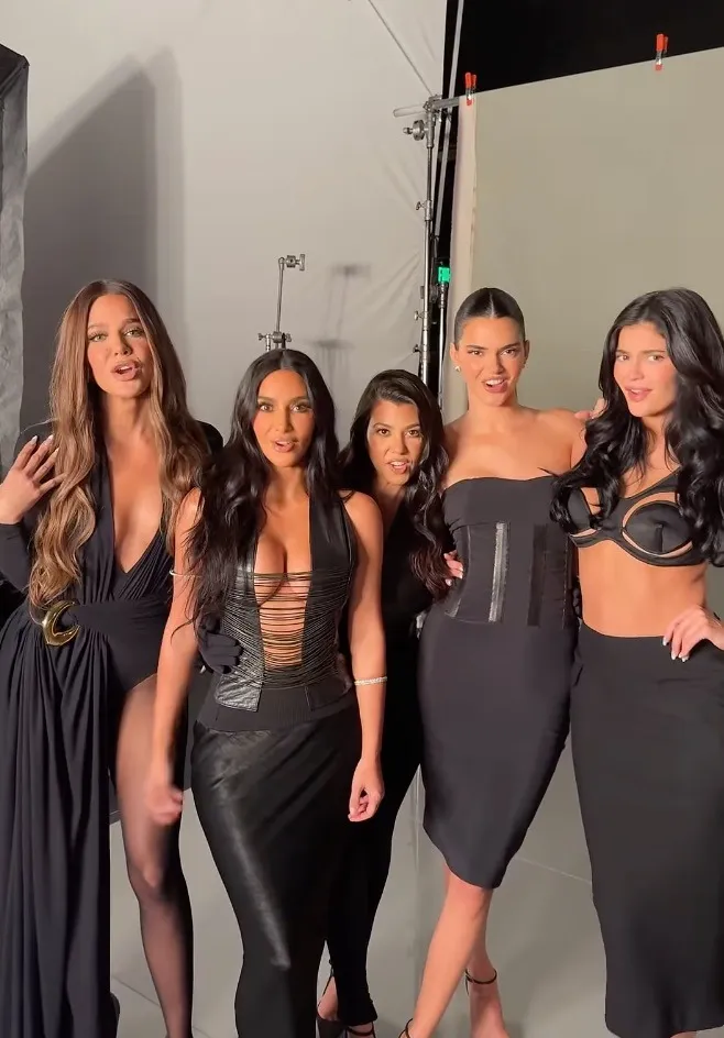 While on set with her sisters, Kourtney was spotted hiding her body while posing with Kim, Kendall, Khloe, and Kylie.