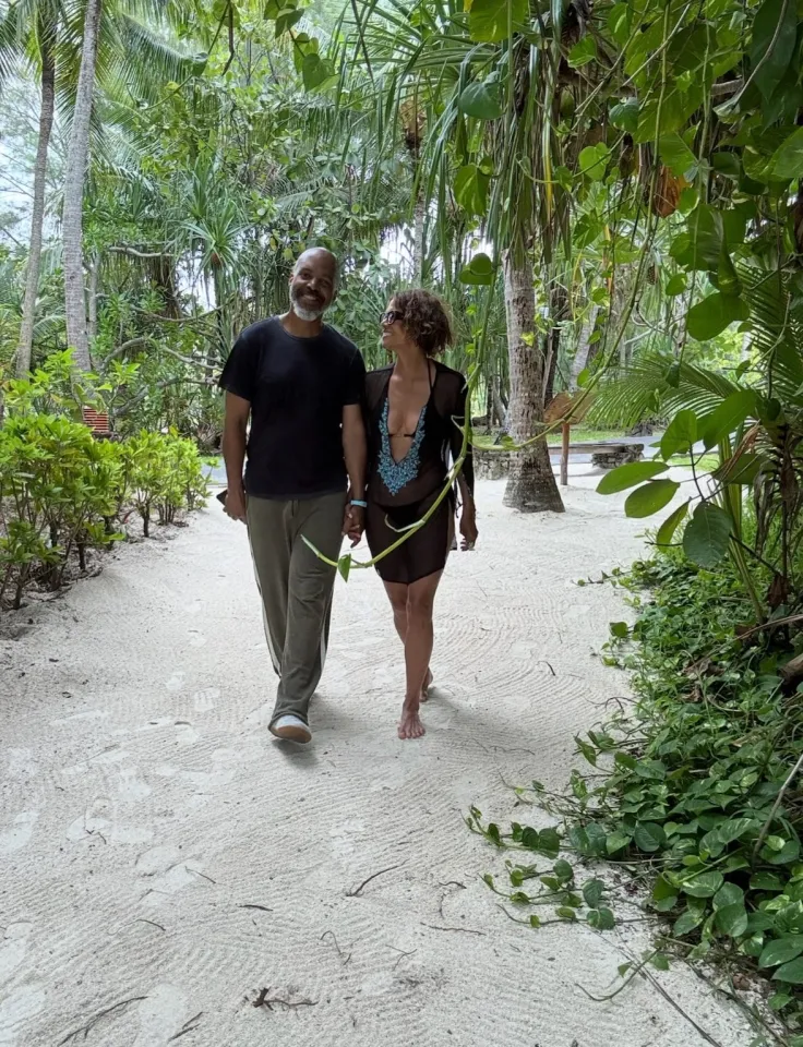Having recently celebrated her 59th birthday, Halle paired her bikini with a black and teal beach cover-up, accessorized with a variety of chunky necklaces and rings. In one photo, she is seen holding hands with Van as they walk through the Bora Bora resort.