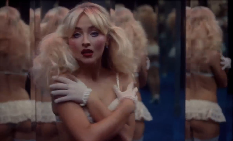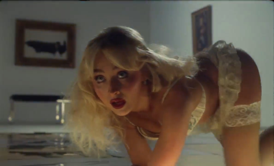 Her attire swiftly transitions into underwear, in typical Sabrina fashion. The attractive celebrity is then shown parading around wearing her signature stockings and suspenders along with heels. She is then seen writhing on a pole while wearing only her panties, as if that wasn’t enough sensual activity.