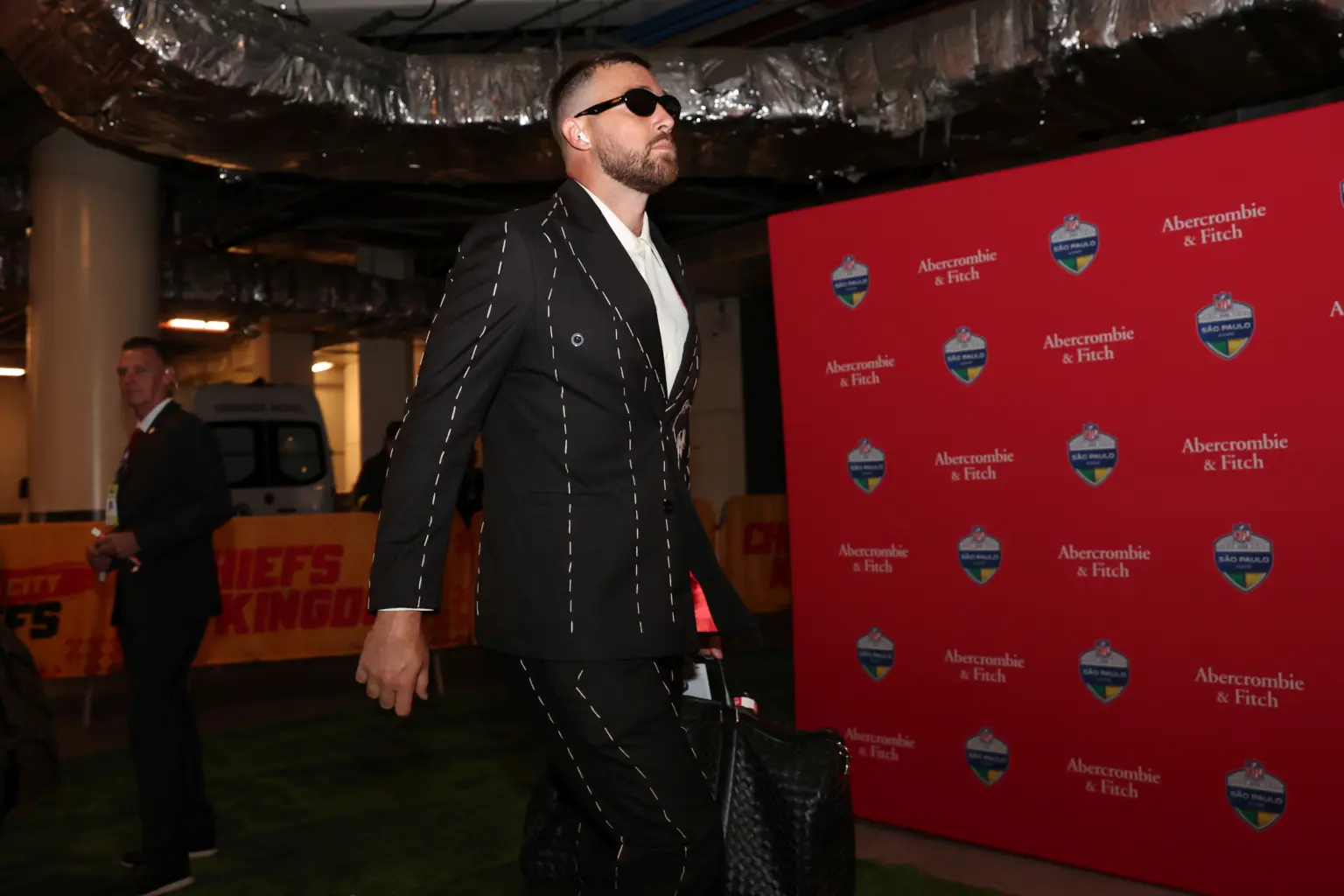 In a hand-embroidered KidSuper suit jacket and matching contrast-stitched pants, the 35-year-old tight end arrived in style at Arena Corinthians in São Paulo, Brazil, on Friday before taking the field for the first game of his 13th season with the NFL.