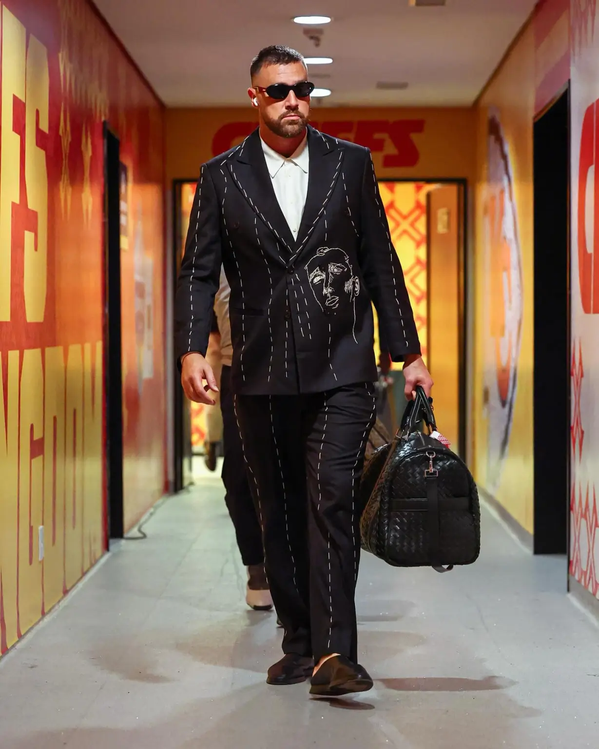 Kelce accessorized with oval-shaped Bottega Veneta sunglasses, Fear of God mules, and his signature intrecciato duffle bag from the high-end brand, which costs an impressive $6,400.