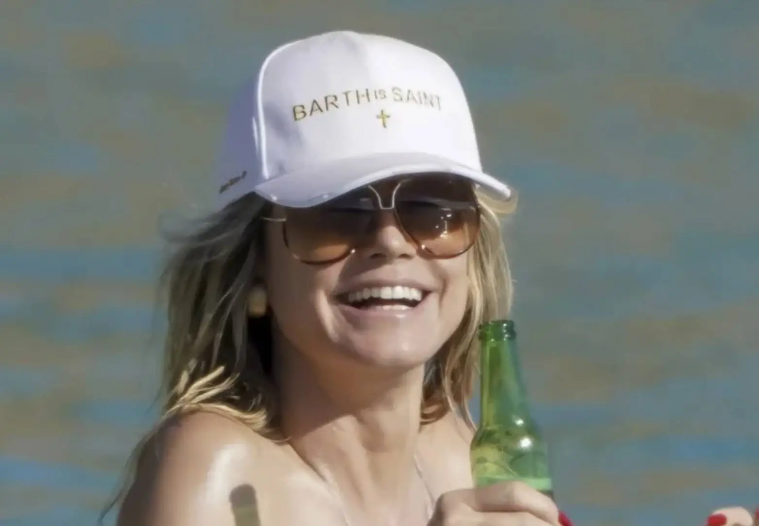 The German model wore huge sunglasses, a white baseball cap over her wavy, damp blonde hair, and a virtually nude appearance that highlighted her toned body and rock-hard abs. Heidi had a nice beer while swimming and relaxing on the sand to further chill off.