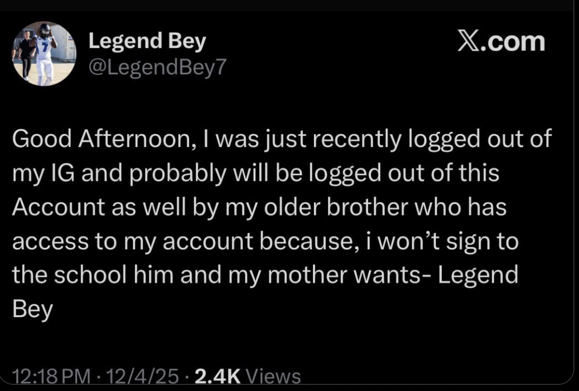“I won’t sign to the school him and my mother wants,” the post read, signed “Legend Bey.”