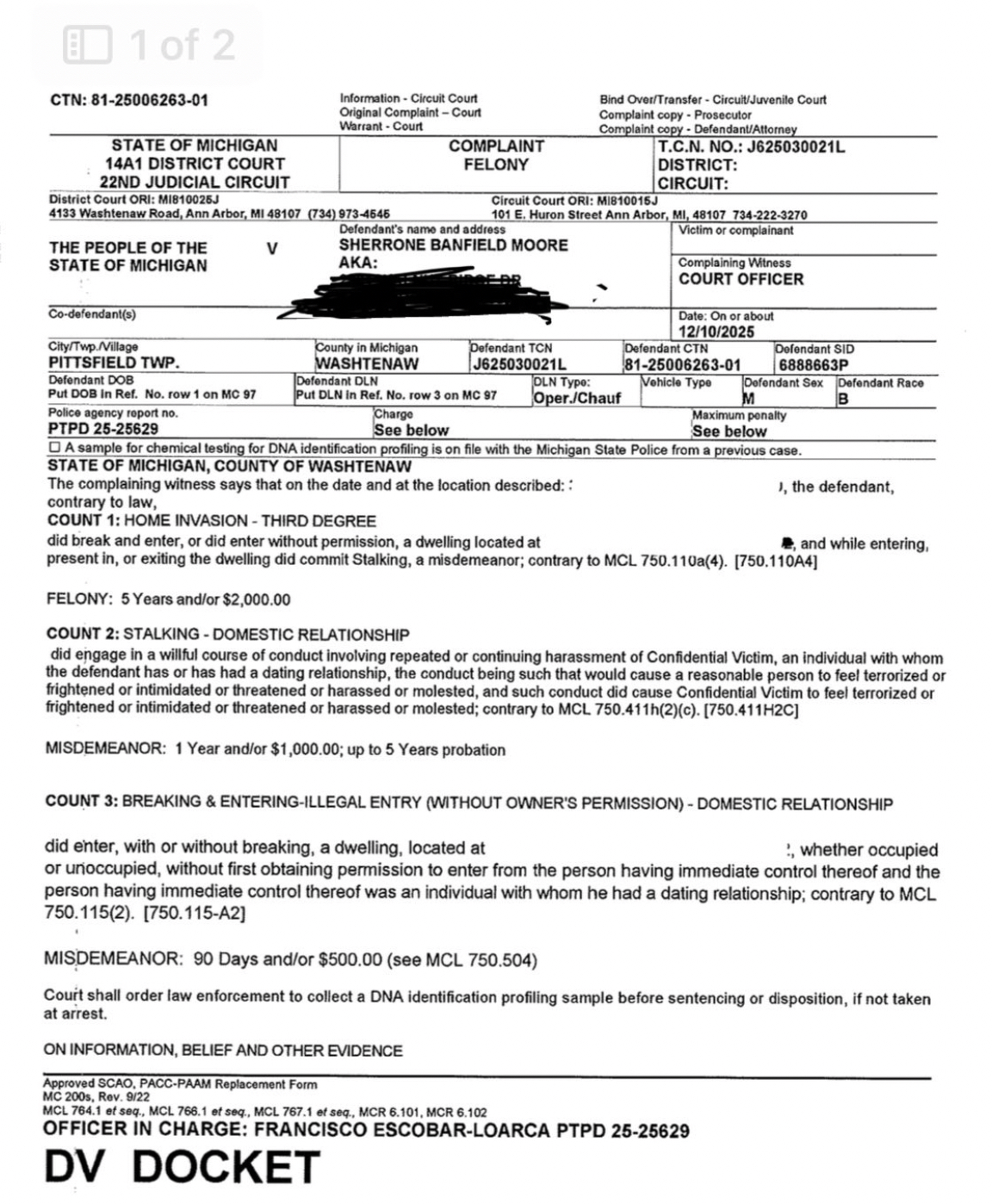 1. Home Invasion – Third Degree (Felony) This is the most serious charge Moore faces. Under Michigan law (MCL 750.110a), third-degree home invasion involves breaking and entering a dwelling (or entering without permission) and committing a misdemeanor (such as stalking or assault) while inside, or violating a probation/parole order.