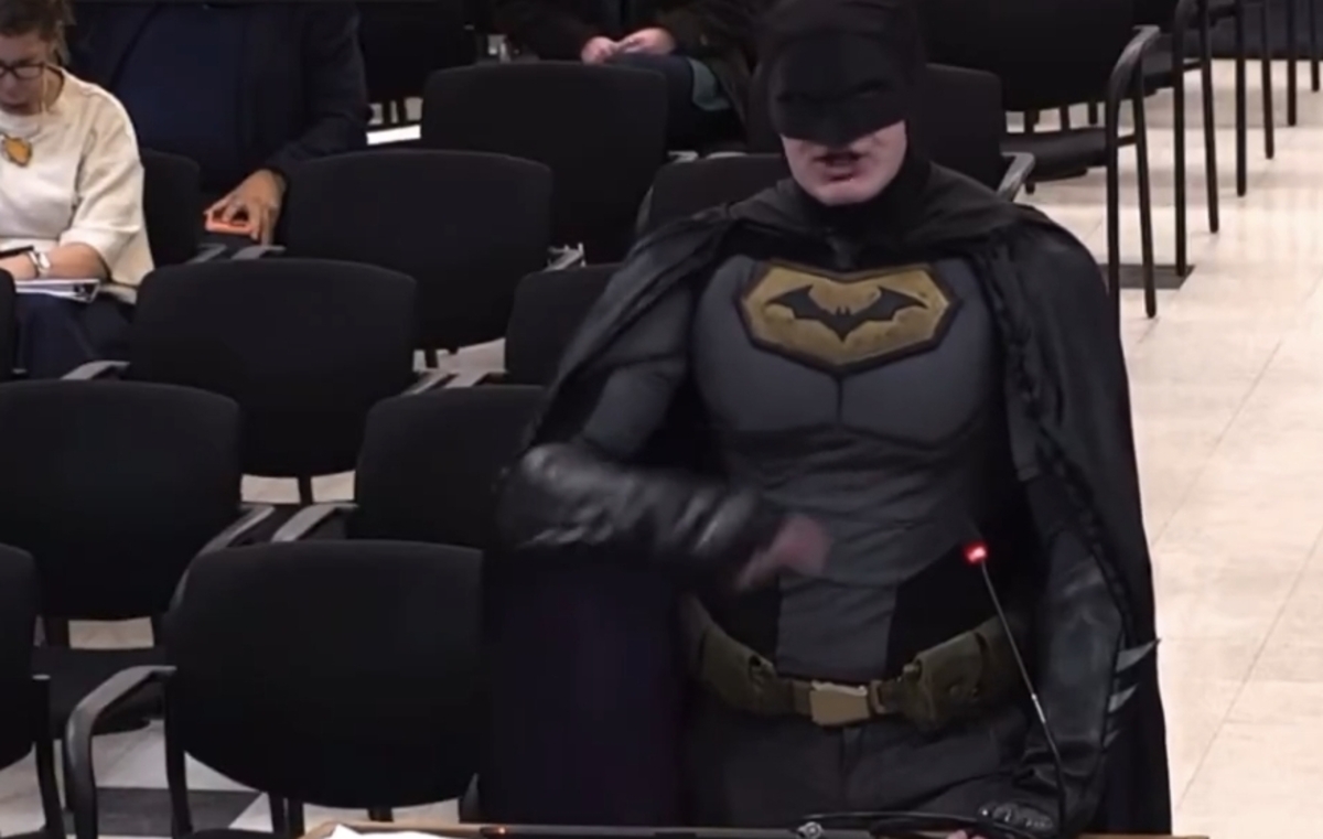 The Caped Crusader opened his statement with a dramatic “Ker-pow!” and slammed his fist on the lectern. Dropping an expletive, the man identified only as Batman, demanded to know what city officials were doing to protect residents.