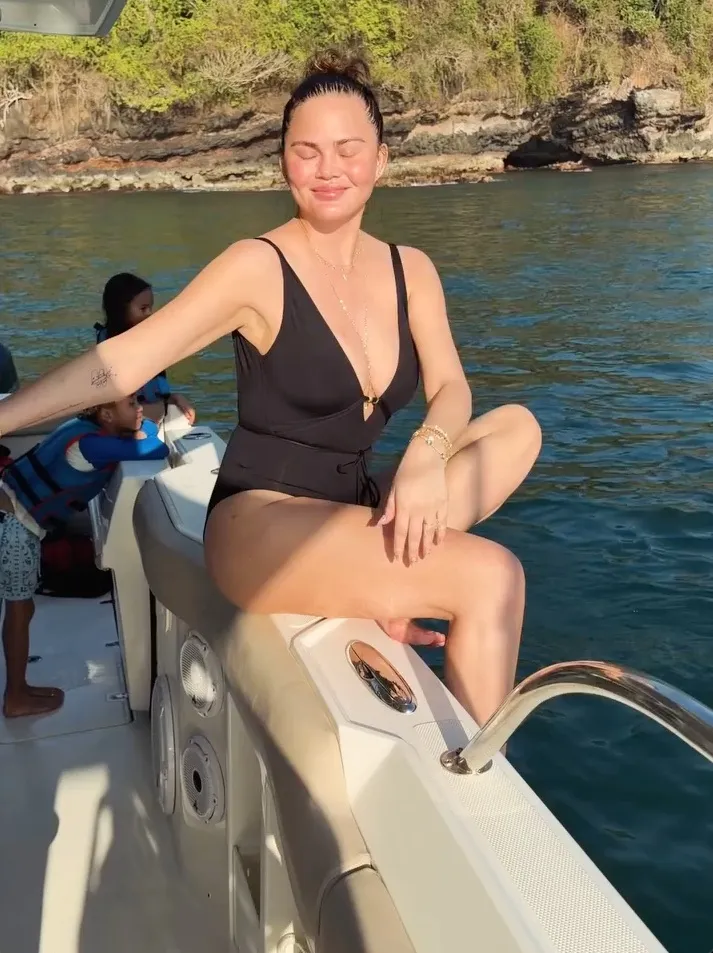 During a lake retreat boat ride with her husband John Legend and their children, Chrissy Teigen looked stunning in a plunging swimsuit.
