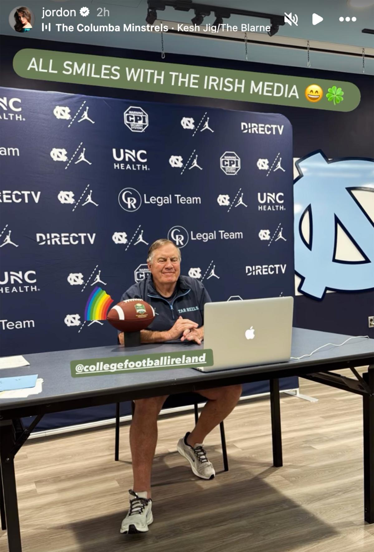 Taking to her Instagram Stories on Tuesday, Jordon Hudson chronicled a media gathering featuring her boyfriend, UNC football coach Bill Belichick, as he prepares for his second year at the helm.