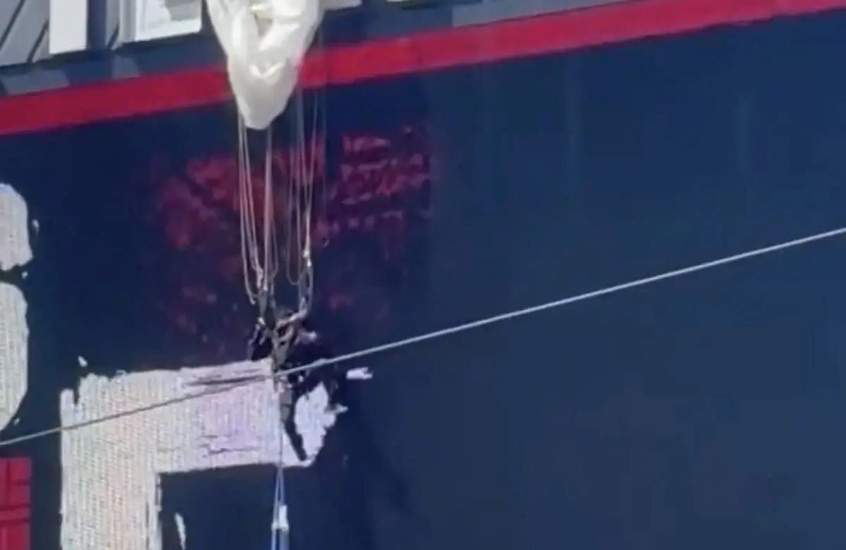 Footage captured by spectators showed the skydiver hitting the structure with significant force before their parachute became entangled in the screen.